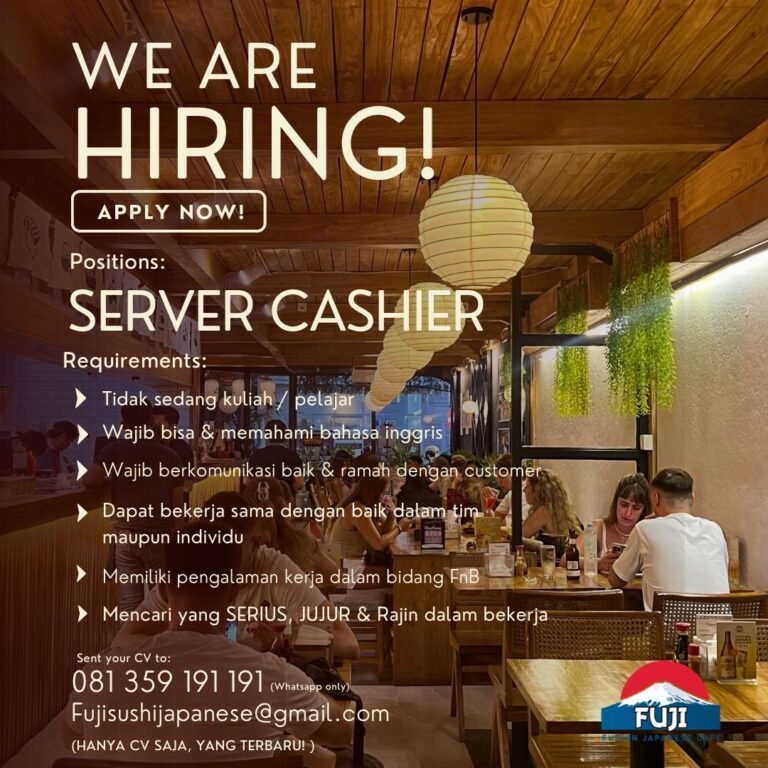 LOKER.BALINEWS.ID, BALI – FUJI Japanese Cafe, sebuah restoran yang bergerak di bidang kuliner Jepang, saat ini sedang membuka peluang karier bagi individu yang bersemangat untuk mengisi posisi Server Cashier. Pihak manajemen mencari kandidat yang serius, jujur, dan rajin dalam bekerja guna memberikan pelayanan terbaik bagi para pelanggan. Selain harus memiliki pengalaman kerja di bidang Food & Beverage (FnB), calon pelamar juga diwajibkan mampu berkomunikasi dengan baik serta ramah dalam melayani setiap pelanggan yang datang.
