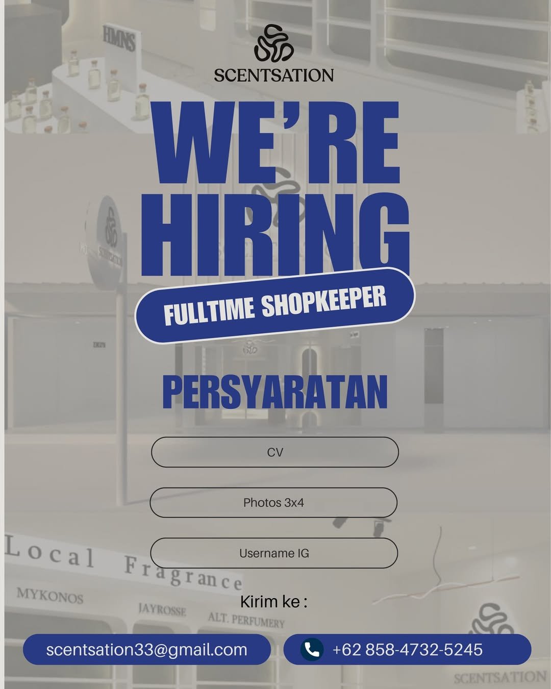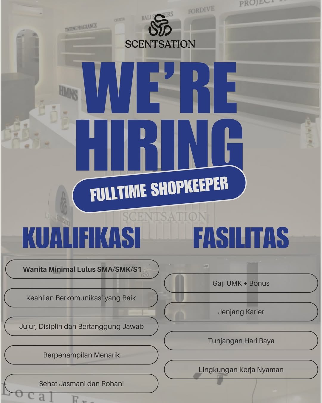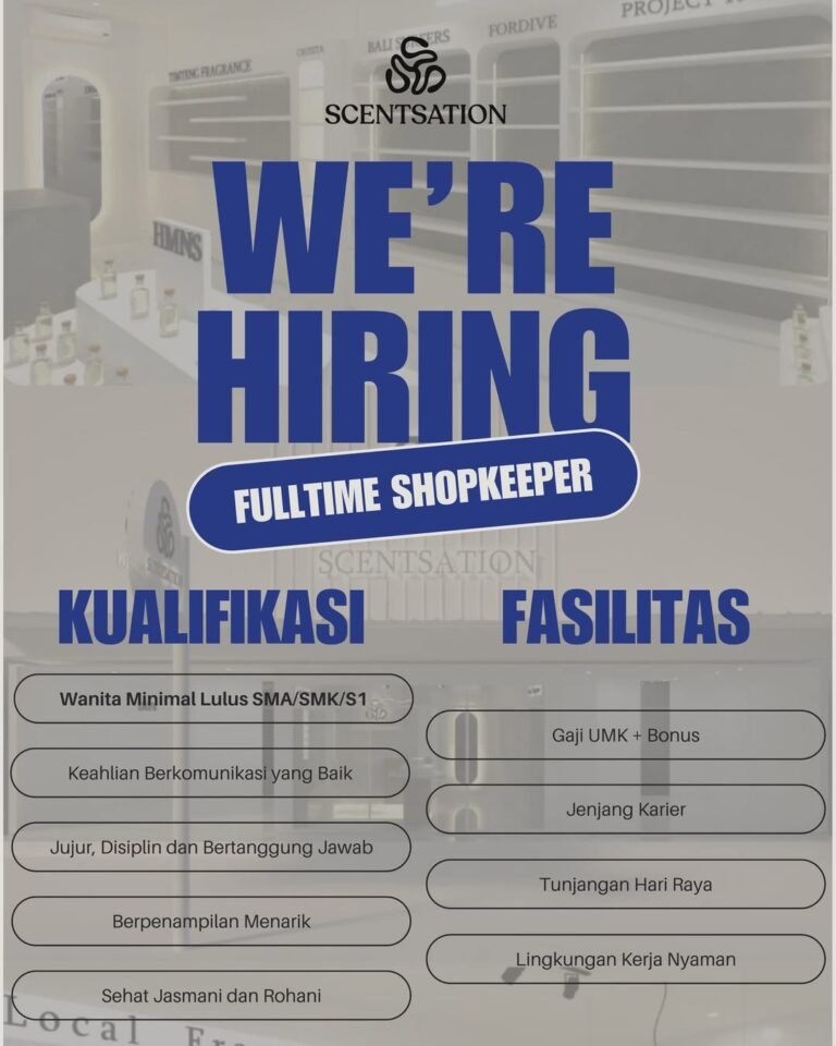LOKER.BALINEWS.ID, BADUNG – Dibuka lowongan kerja Bali terbaru untuk posisi Full Time Shopkeeper di Scentsation, brand retail fragrance yang sedang berkembang di Bali. Kesempatan ini terbuka bagi kandidat wanita minimal lulusan SMA/SMK/S1 yang memiliki kemampuan komunikasi yang baik serta berpenampilan menarik.