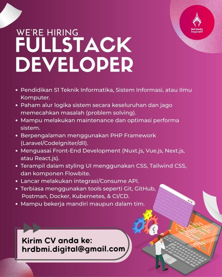 LOKER.BALINEWS.ID, BALI – PT Bali Media Inspiratif saat ini sedang membuka kesempatan karier bagi talenta teknologi melalui lowongan pekerjaan sebagai Fullstack Developer. Posisi ini diperuntukkan bagi kandidat yang memiliki latar belakang pendidikan minimal S1 Teknik Informatika, Sistem Informasi, atau Ilmu Komputer, serta memiliki kemampuan pemecahan masalah (problem solving) yang kuat dalam mengelola alur logika sistem secara menyeluruh.
