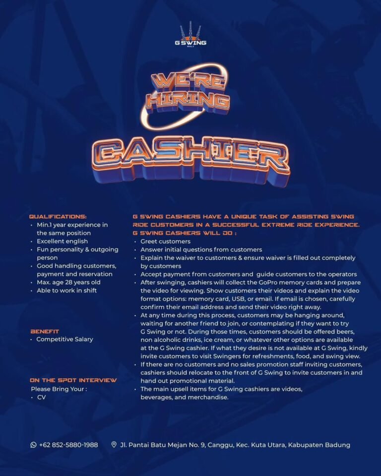 Tanggung jawab utama seorang kasir di G Swing mencakup menyapa pelanggan, menjelaskan surat pernyataan (waiver), memproses pembayaran, serta melakukan upselling pada produk video, minuman, dan merchandise. Selain itu, kasir juga berperan dalam mengelola kartu memori GoPro setelah pelanggan selesai bermain dan membantu mengirimkan video hasil rekaman tersebut. Bagi kandidat yang memenuhi syarat, perusahaan menawarkan gaji yang kompetitif. Pelamar dapat langsung mengikuti proses On The Spot Interview dengan membawa CV ke Jl. Pantai Batu Mejan No. 9, Canggu, atau menghubungi nomor WhatsApp +62 852-5880-1988 untuk informasi lebih lanjut.