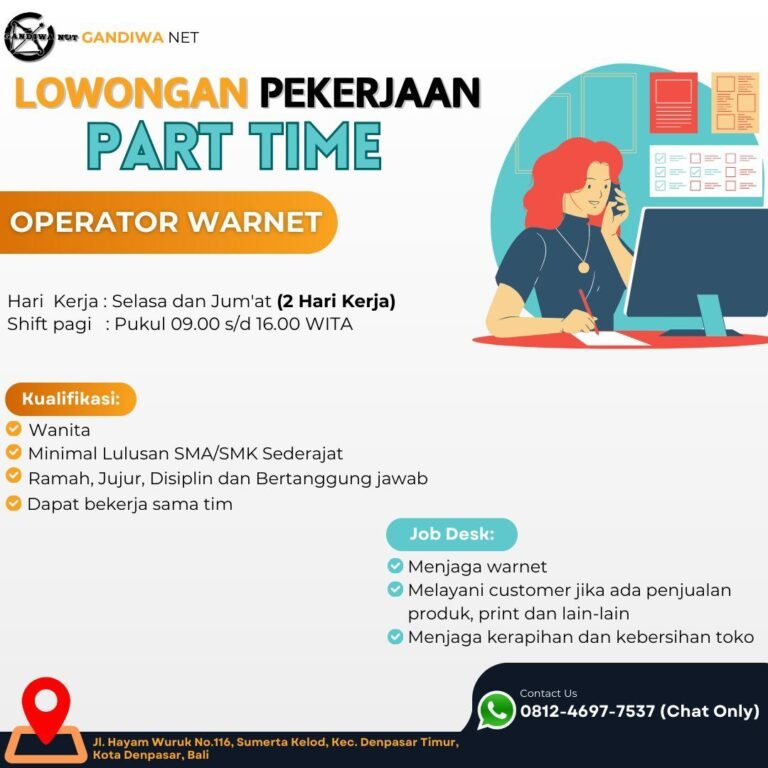 LOKER.BALINEWS.ID, DENPASAR — Gandiwa Net membuka lowongan part time untuk posisi Operator Warnet dengan jadwal kerja dua hari dalam seminggu, yaitu Selasa dan Jumat, pada shift pagi pukul 09.00–16.00 WITA. Lowongan ini ditujukan bagi perempuan lulusan minimal SMA/SMK sederajat yang ramah, jujur, disiplin, serta mampu bekerja sama dalam tim.