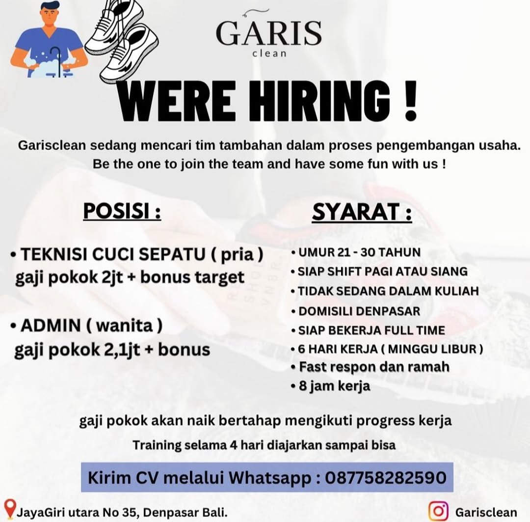 LOKER.BALINEWS.ID, DENPASAR — GarisClean, salah satu layanan perawatan dan cuci sepatu di Denpasar, tengah membuka peluang kerja bagi kandidat yang ingin bergabung dalam tim. Perusahaan ini mencari Teknisi Cuci Sepatu (pria) serta Admin (wanita) untuk mendukung proses pengembangan usaha. Posisi yang dibuka menawarkan gaji pokok, bonus target, serta kesempatan peningkatan pendapatan seiring perkembangan kinerja.