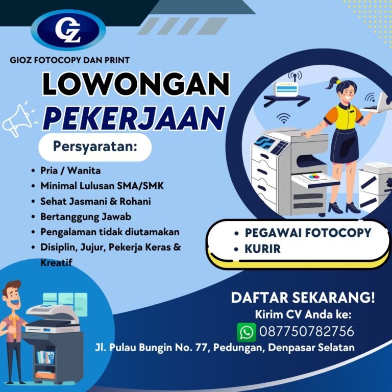 LOKER.BALINEWS.ID, DENPASAR – Gioz Fotocopy dan Print, salah satu penyedia jasa penggandaan dokumen yang berlokasi di wilayah Pedungan, Denpasar Selatan, kini tengah membuka kesempatan kerja bagi tenaga kerja lokal. Perusahaan sedang mencari individu yang berdedikasi untuk mengisi dua posisi sekaligus, yakni sebagai Pegawai Fotocopy dan Kurir. Kesempatan ini terbuka lebar bagi masyarakat yang mengutamakan kedisiplinan dan kerja keras dalam lingkungan kerja yang dinamis.