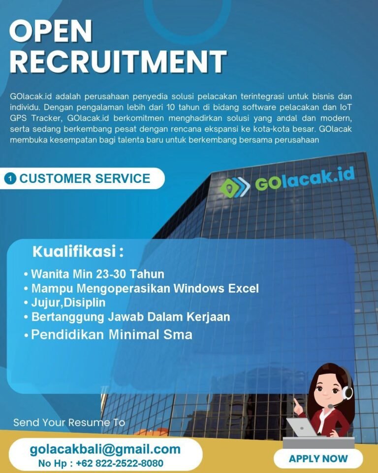 LOKER.BALINEWS.ID, BALI – GOlacak.id, perusahaan penyedia solusi pelacakan terintegrasi yang telah berpengalaman lebih dari 10 tahun di bidang software pelacakan dan IoT GPS Tracker, kini membuka kesempatan bagi talenta baru untuk bergabung. Seiring dengan rencana ekspansi besar-besaran ke berbagai kota besar di Indonesia, perusahaan sedang mencari individu yang berdedikasi untuk mengisi posisi Customer Service. Kesempatan ini merupakan pintu bagi Anda yang ingin berkembang di industri teknologi yang sedang tumbuh pesat.