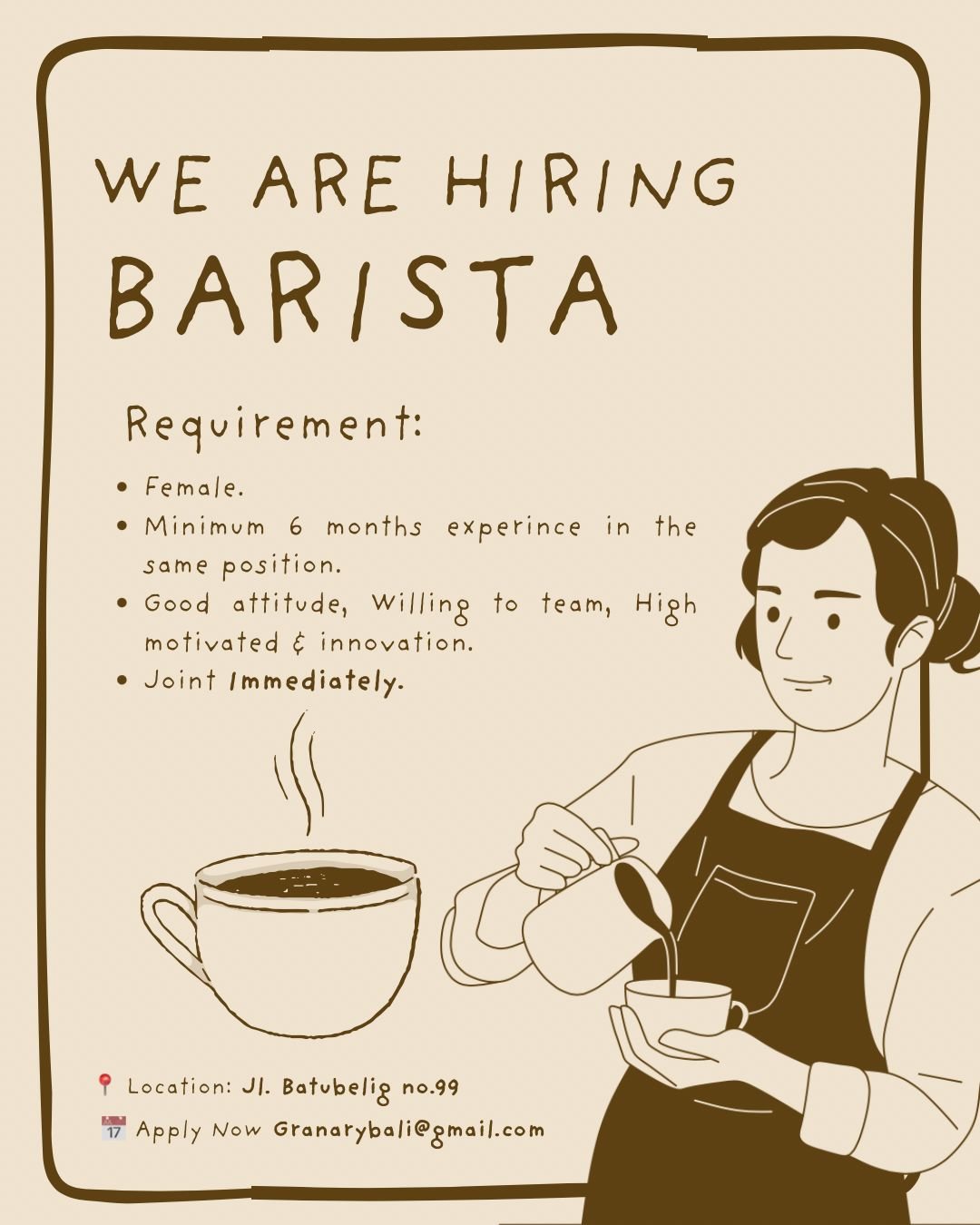 LOKER.BALINEWS.ID, BADUNG – Granary Bali, sebuah destinasi kuliner yang berlokasi di area strategis Batubelig, saat ini sedang membuka kesempatan karir bagi individu yang bersemangat di dunia kopi untuk mengisi posisi Barista. Perusahaan mencari kandidat perempuan yang memiliki motivasi tinggi serta inovasi dalam menyajikan minuman berkualitas bagi para pelanggan. Penempatan kerja akan difokuskan di outlet mereka yang beralamat di Jalan Batubelig No. 99.