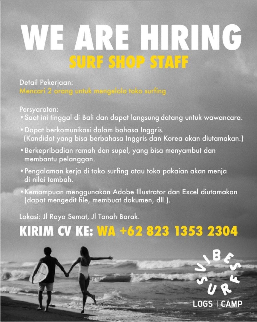 Posisi Graphic Designer bertugas membuat desain untuk kebutuhan Vibes Surfboards dan Vibes Surf Camp, dengan kualifikasi mahir Adobe Illustrator dan Photoshop, berpengalaman minimal 2 tahun, serta wajib melampirkan CV dan portofolio. Untuk posisi Surf Camp Driver, kandidat wajib memiliki SIM A, mampu berbahasa Inggris, ramah terhadap pelanggan, disiplin waktu, dan siap bekerja pagi hari. Sementara Surf Shop Staff bertugas mengelola toko surfing, melayani pelanggan, dan diutamakan mampu berbahasa Inggris serta memiliki pengalaman retail. Bagi pelamar yang berminat, silakan mengirimkan CV melalui WhatsApp sesuai kontak yang tertera pada informasi lowongan.
