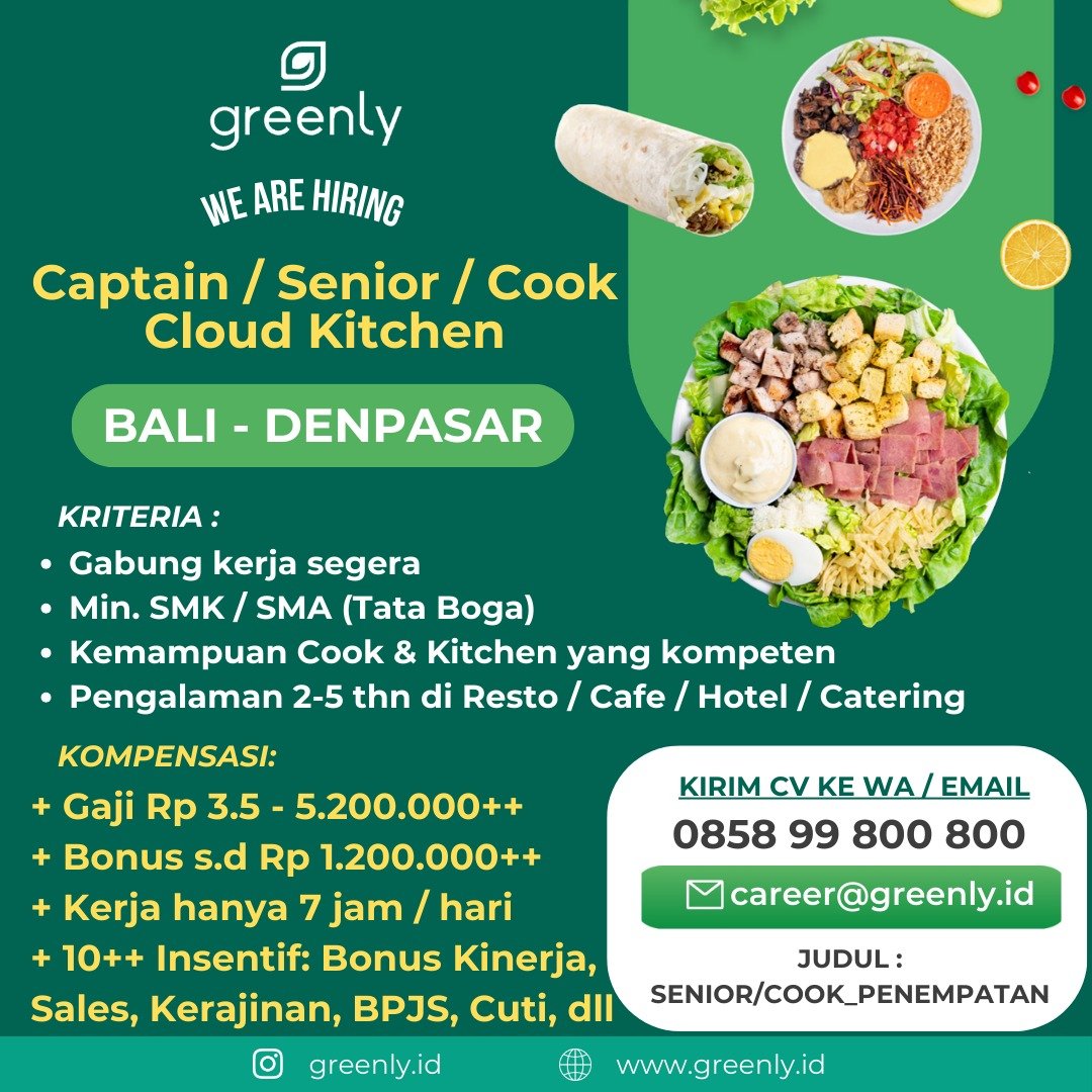 LOKER.BALINEWS.ID, DENPASAR – Greenly, perusahaan kuliner yang berfokus pada makanan sehat, saat ini sedang membuka kesempatan berkarir bagi tenaga profesional di bidang dapur untuk mengisi posisi Captain, Senior, dan Cook Cloud Kitchen. Lowongan ini mencari kandidat yang siap bergabung segera dengan kualifikasi pendidikan minimal SMK atau SMA sederajat, diutamakan dari jurusan Tata Boga. Calon pelamar diwajibkan memiliki kemampuan memasak yang kompeten serta pengalaman kerja selama 2 hingga 5 tahun di industri restoran, kafe, hotel, atau katering.