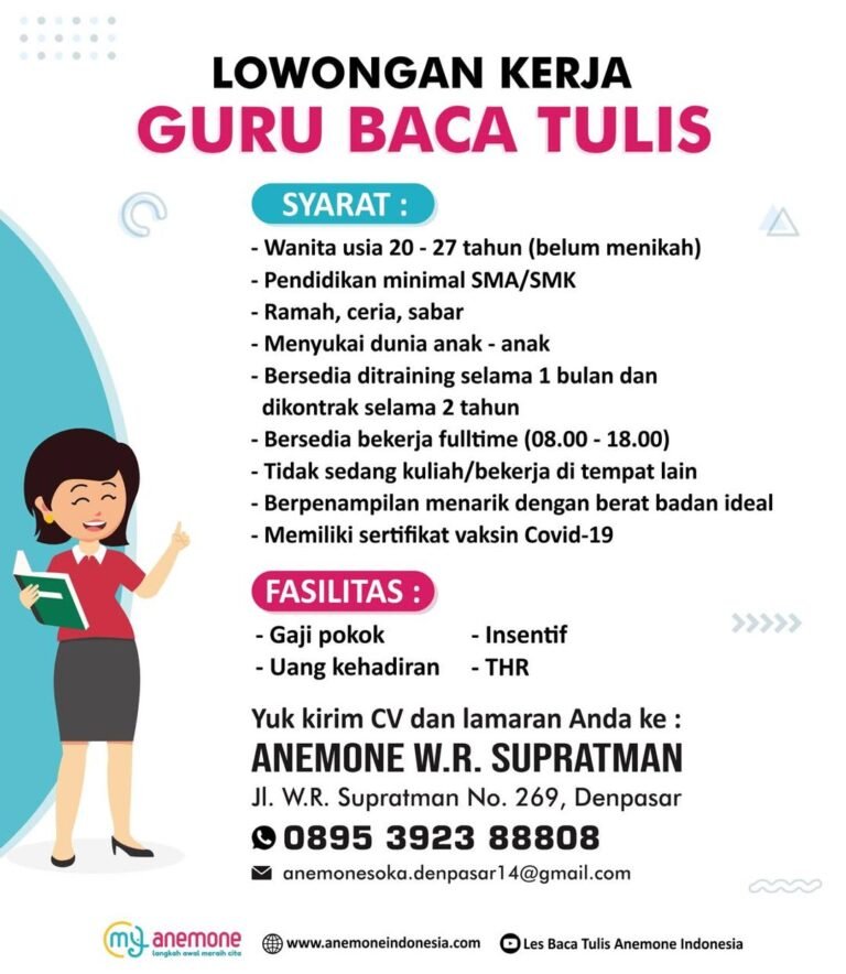 LOKER.BALINEWS.ID, DENPASAR – Lembaga pendidikan Anemone W.R. Supratman yang berlokasi di Denpasar saat ini membuka lowongan kerja Bali untuk posisi Guru Baca Tulis. Lowongan ini dibuka khusus bagi wanita yang memiliki minat dan kepedulian tinggi terhadap dunia pendidikan anak.