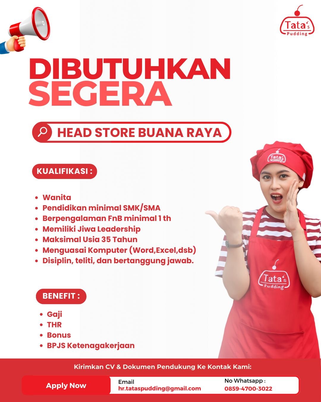 Kirimkan CV & dokumen pendukung melalui email hr.tataspudding@gmail.com atau WhatsApp 0859-4700-3022.