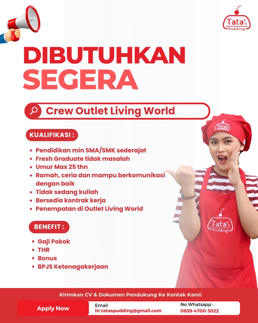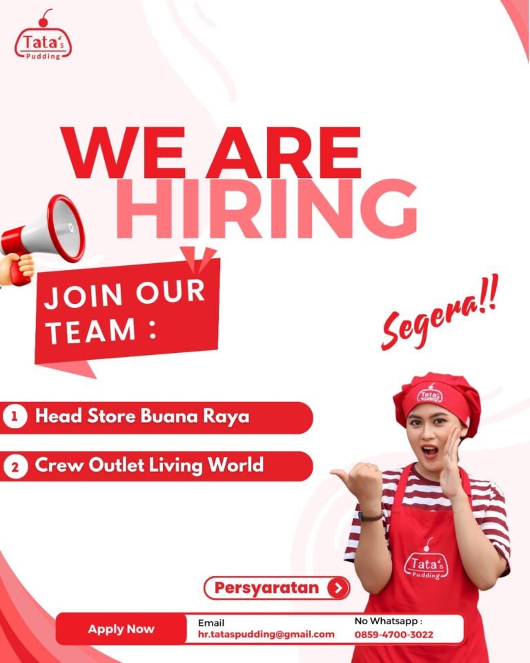 Kirimkan CV & dokumen pendukung melalui email hr.tataspudding@gmail.com atau WhatsApp 0859-4700-3022.