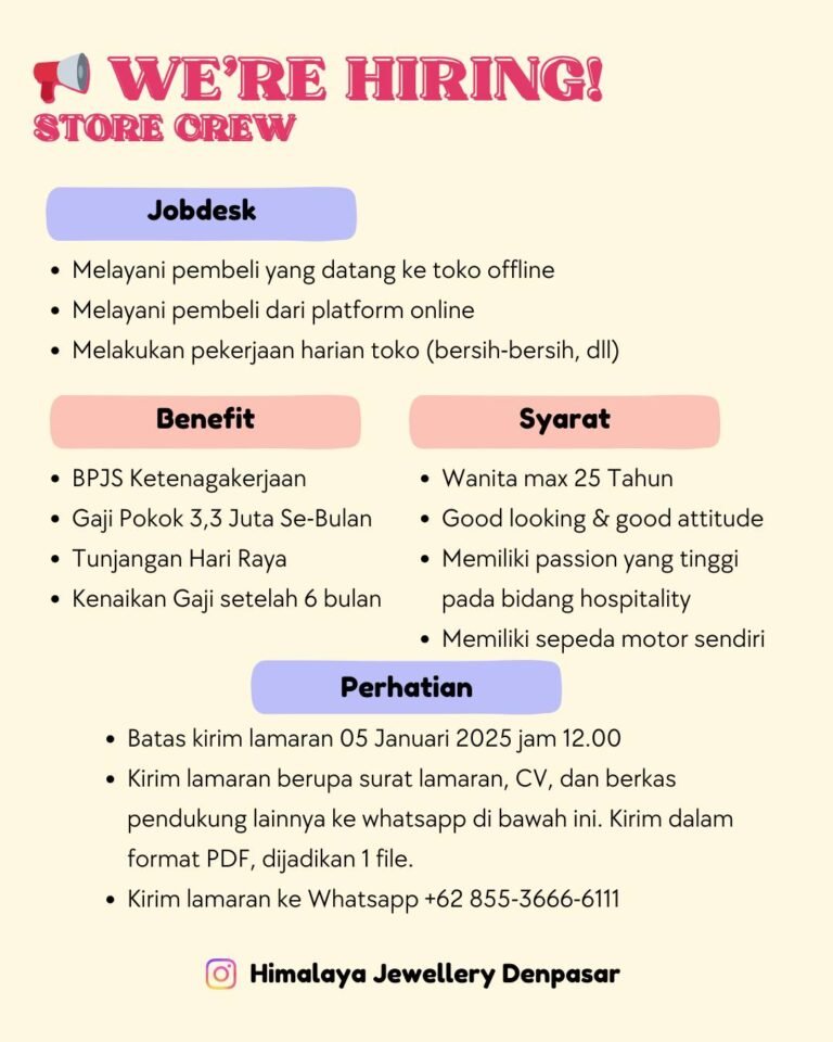 LOKER.BALINEWS.ID, DENPASAR — Himalaya Jewellery Denpasar membuka rekrutmen untuk posisi Store Crew. Tugas utama meliputi melayani pembeli di toko offline maupun platform online, serta membantu pekerjaan harian toko. Perusahaan menargetkan kandidat perempuan maksimal usia 25 tahun, berpenampilan menarik, memiliki attitude yang baik, passion di bidang hospitality, dan memiliki sepeda motor sendiri. Fasilitas yang ditawarkan antara lain BPJS Ketenagakerjaan, gaji pokok Rp3,3 juta per bulan, tunjangan hari raya, serta kenaikan gaji setelah enam bulan.