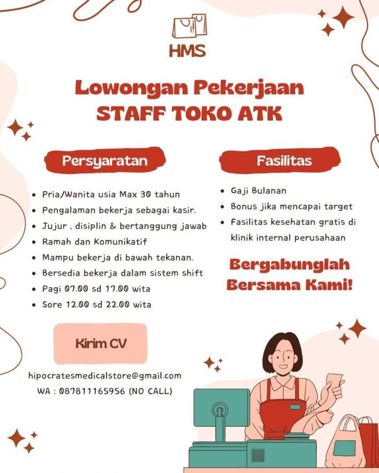 LOKER.BALINEWS.ID, BALI – HMS, sebuah unit usaha retail alat tulis kantor (ATK), saat ini sedang membuka kesempatan berkarir bagi individu yang berdedikasi untuk mengisi posisi Staff Toko ATK. Perusahaan mencari kandidat yang siap memberikan pelayanan terbaik kepada pelanggan dan mampu menjaga kelancaran operasional toko di wilayah Bali. Langkah rekrutmen ini merupakan bagian dari upaya HMS untuk memperkuat tim pelayanan mereka seiring dengan meningkatnya kebutuhan konsumen.