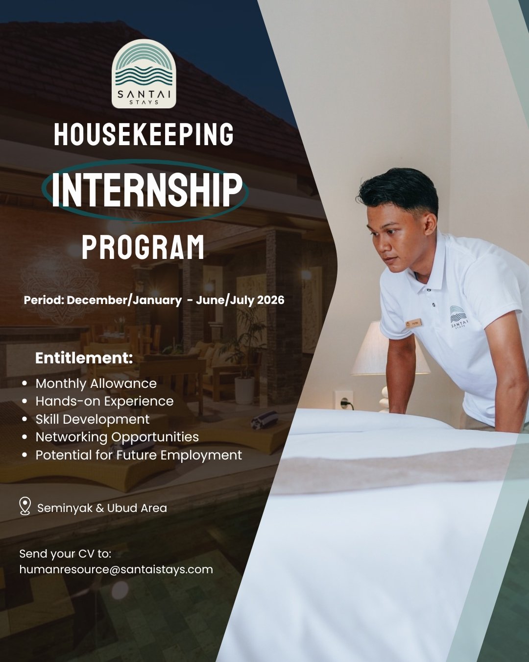 LOKER.BALINEWS.ID, BADUNG — Santai Stays membuka kesempatan program magang Housekeeping untuk area Seminyak & Ubud. Program ini memberikan pengalaman kerja langsung di industri hospitality, dengan bimbingan tim profesional dan lingkungan kerja yang mendukung pengembangan skill.