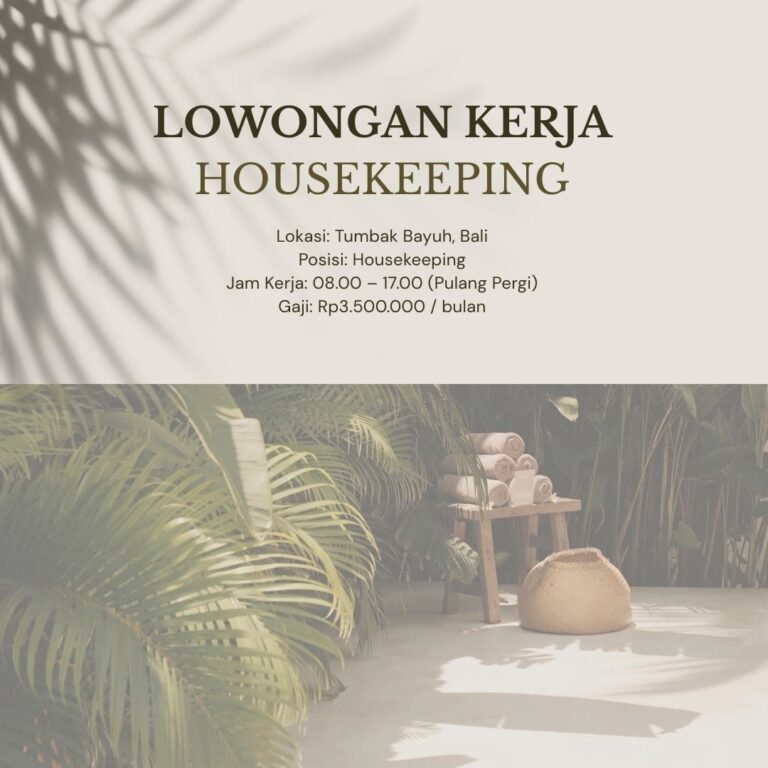 LOKER.BALINEWS.ID, BALI — Sebuah villa/rumah tinggal di kawasan Tumbak Bayuh, Bali, membuka lowongan kerja untuk posisi Housekeeping dengan sistem kerja pulang-pergi. Pencari kerja yang memiliki pengalaman di bidang kebersihan, khususnya di hotel atau villa, diutamakan untuk mengikuti proses seleksi.