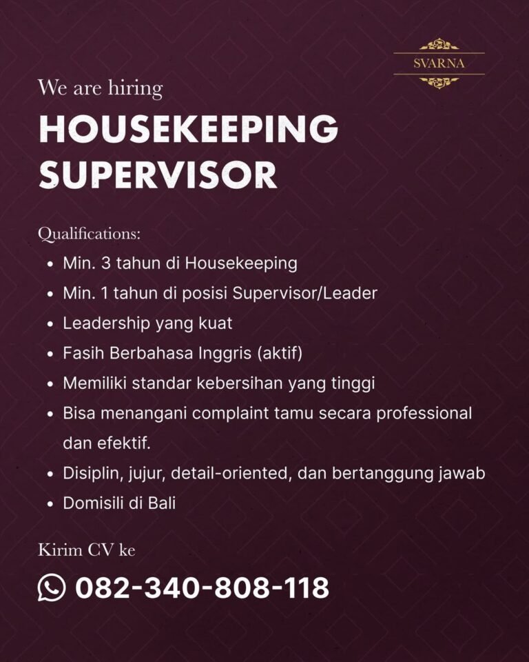 LOKER.BALINEWS.ID, BALI – Svarna saat ini sedang membuka kesempatan karir bagi tenaga profesional di bidang perhotelan untuk menempati posisi strategis sebagai Housekeeping Supervisor. Lowongan ini ditujukan bagi kandidat yang memiliki pengalaman minimal 3 tahun di departemen Housekeeping, dengan setidaknya 1 tahun pengalaman pada posisi Supervisor atau Leader. Pelamar diwajibkan memiliki domisili di Bali untuk memudahkan koordinasi operasional.