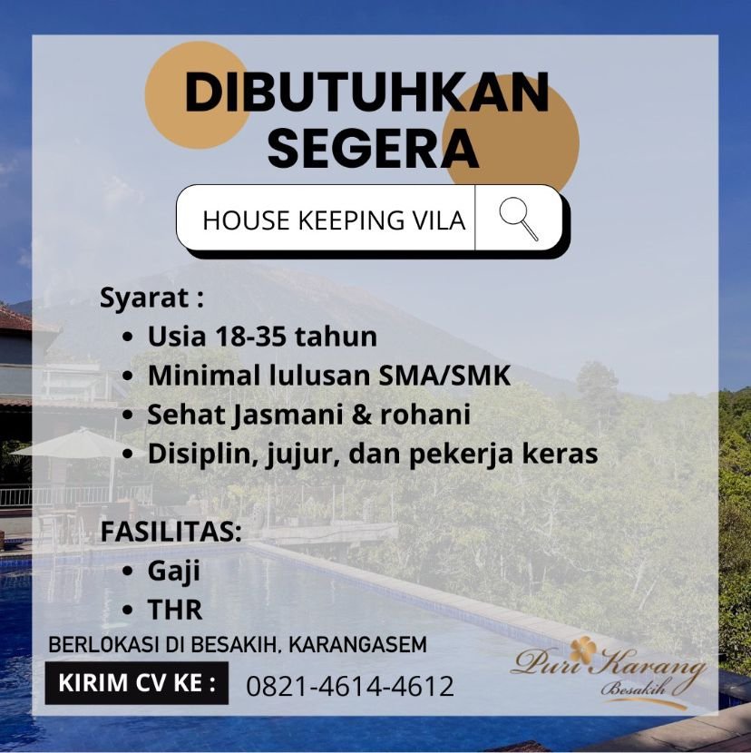 LOKER.BALINEWS.ID, KARANGASEM — Puri Karang Besakih membuka Lowongan Kerja Bali Housekeeping Villa di Puri Karang Besakih untuk penempatan di kawasan Besakih, Karangasem. Perusahaan mencari kandidat yang teliti, disiplin, serta mampu menjaga kebersihan dan kerapian area villa secara profesional.