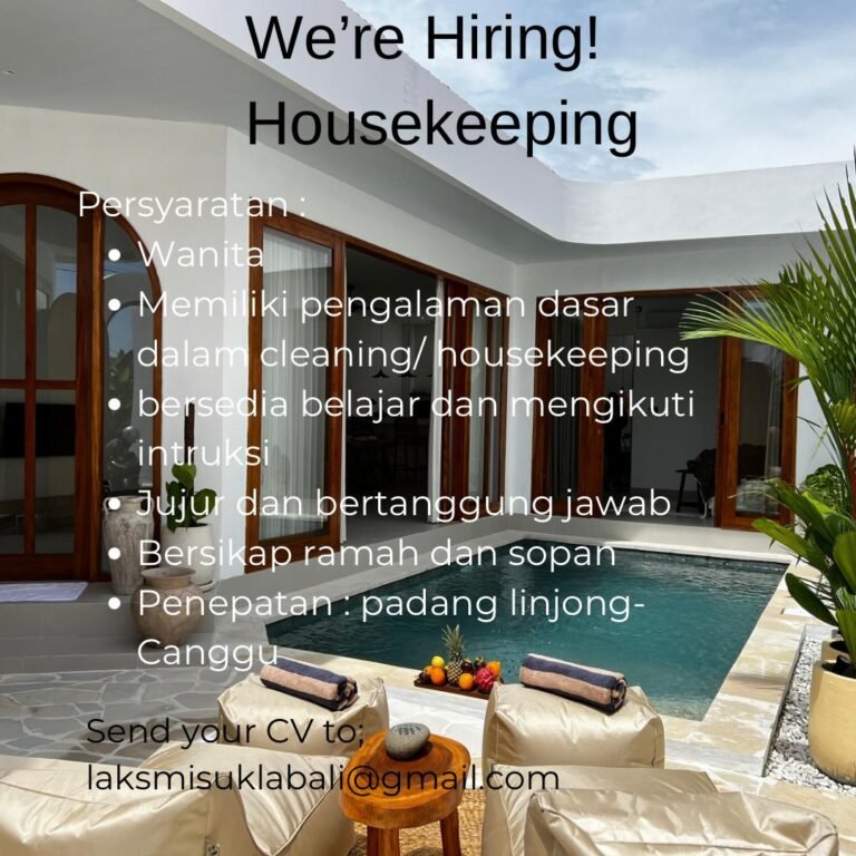 LOKER.BALINEWS.ID, BADUNG – Sebuah villa privat yang berlokasi di kawasan populer Padang Linjong, Canggu, saat ini tengah membuka kesempatan kerja untuk posisi Housekeeping. Lowongan ini dikhususkan bagi tenaga kerja wanita yang memiliki dedikasi tinggi dalam menjaga kebersihan dan kenyamanan lingkungan villa. Pihak manajemen mencari kandidat yang siap memberikan layanan terbaik bagi para tamu yang menginap di kawasan premium tersebut.