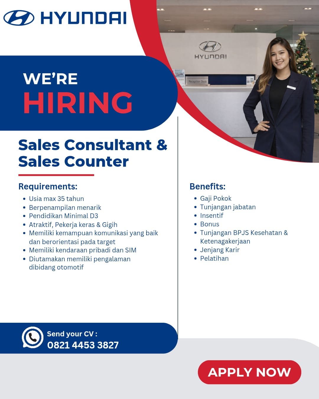 LOKER.BALINEWS.ID, DENPASAR – Dealer resmi Hyundai di Denpasar saat ini tengah membuka peluang karir bagi para profesional muda yang ambisius untuk mengisi posisi Sales Consultant dan Sales Counter. Perusahaan mencari kandidat yang memiliki penampilan menarik serta kemampuan komunikasi yang baik untuk menjadi ujung tombak penjualan unit kendaraan Hyundai. Posisi ini menawarkan jenjang karir yang menjanjikan serta berbagai program pelatihan intensif untuk membekali staf dengan pengetahuan produk otomotif yang mendalam.