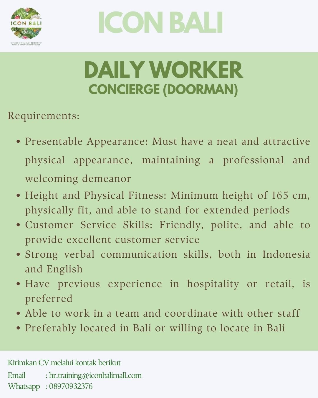 Kandidat yang berminat diharapkan mampu bekerja secara tim serta berkoordinasi dengan baik bersama staf lainnya. Posisi ini diprioritaskan bagi mereka yang saat ini berdomisili di Bali atau bersedia untuk ditempatkan di Bali. Jika Anda memenuhi persyaratan tersebut, silakan kirimkan CV terbaru Anda melalui email ke hr.training@iconbalimall.com atau melalui WhatsApp di nomor 08970932376.