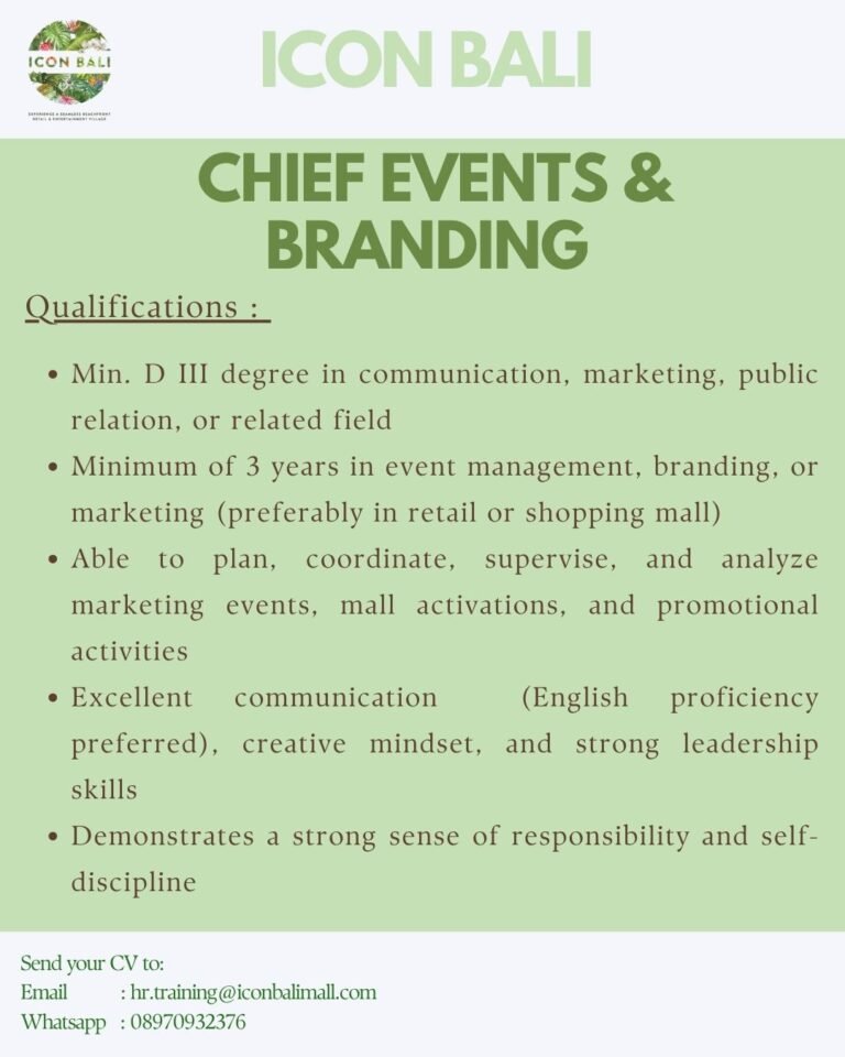 LOKER.BALINEWS.ID, DENPASAR – Icon Bali, pusat perbelanjaan dan hiburan terkemuka di Sanur, kini membuka kesempatan karir bagi para profesional kreatif untuk mengisi posisi strategis sebagai Chief Events & Branding. Lowongan ini ditujukan bagi individu yang memiliki visi kuat dalam memperkuat identitas merek serta mampu mengelola berbagai aktivasi menarik di lingkungan retail. Mengingat lokasi Icon Bali yang berada di kawasan wisata premium, peran ini menjadi sangat krusial dalam menjaga standar pengalaman pengunjung melalui acara-acara yang inovatif.