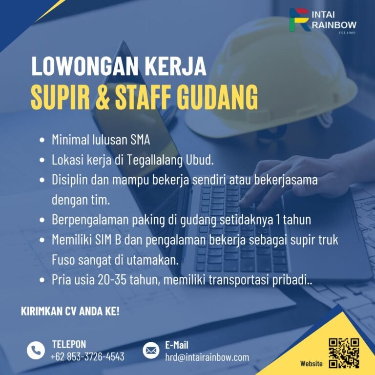 LOKER.BALINEWS.ID, GIANYAR – Perusahaan Intai Rainbow yang berlokasi di kawasan Tegallalang, Ubud, saat ini sedang membuka kesempatan berkarir bagi tenaga kerja lokal untuk mengisi posisi strategis sebagai Supir dan Staff Gudang. Kesempatan ini ditujukan bagi individu yang memiliki etos kerja tinggi, disiplin, serta mampu beradaptasi dalam lingkungan kerja yang dinamis, baik secara mandiri maupun di dalam tim. Dengan lokasi kerja di salah satu titik pariwisata utama Gianyar, posisi ini menawarkan peluang stabilitas karir bagi mereka yang berdomisili di sekitar Ubud dan sekitarnya.