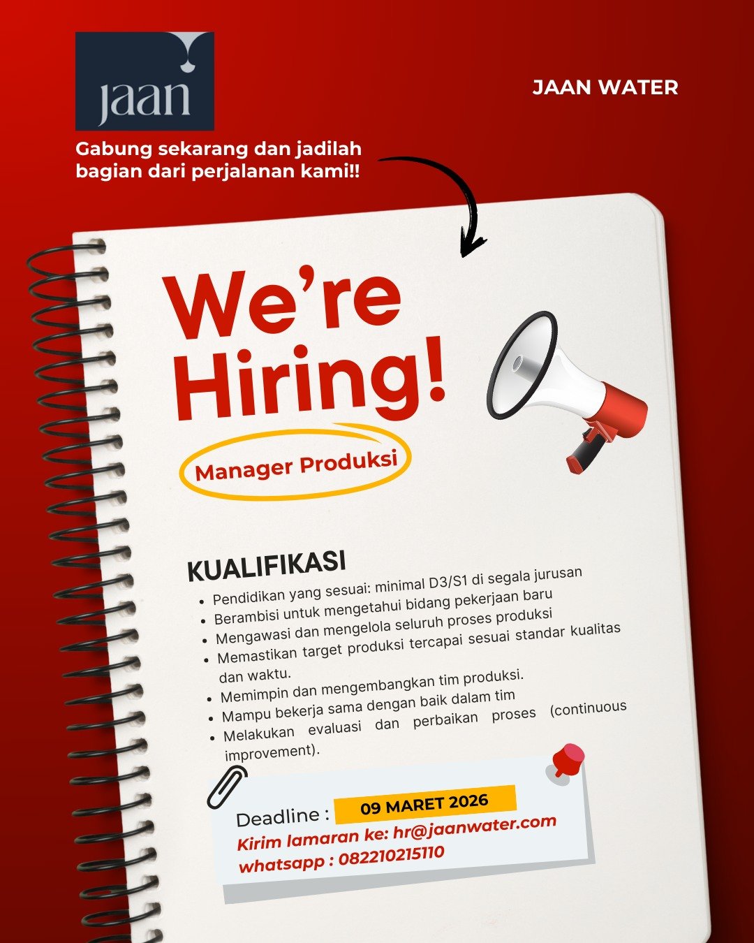 Bagi Anda yang memenuhi kualifikasi dan siap menerima tantangan ini, segera kirimkan berkas lamaran Anda sebelum batas akhir pendaftaran pada 09 Maret 2026. Lamaran dapat dikirimkan secara daring melalui alamat email resmi hr@jaanwater.com atau melalui pesan WhatsApp ke nomor 082210215110. Jangan lewatkan kesempatan emas ini untuk meniti karir manajerial di industri yang berkembang pesat bersama Jaan Water.