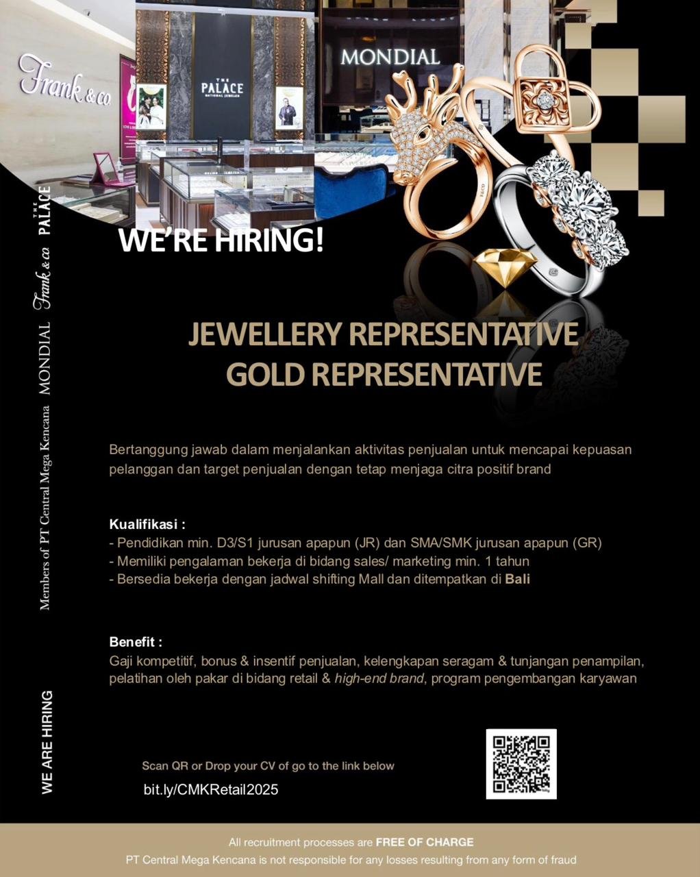 LOKER.BALINEWS.ID, BADUNG – PT Central Mega Kencana membuka lowongan kerja terbaru di Bali untuk posisi Jewellery Representative dan Gold Representative. Posisi ini bertanggung jawab dalam menjalankan aktivitas penjualan produk perhiasan premium serta menjaga kepuasan pelanggan dan citra positif brand di lingkungan mall.