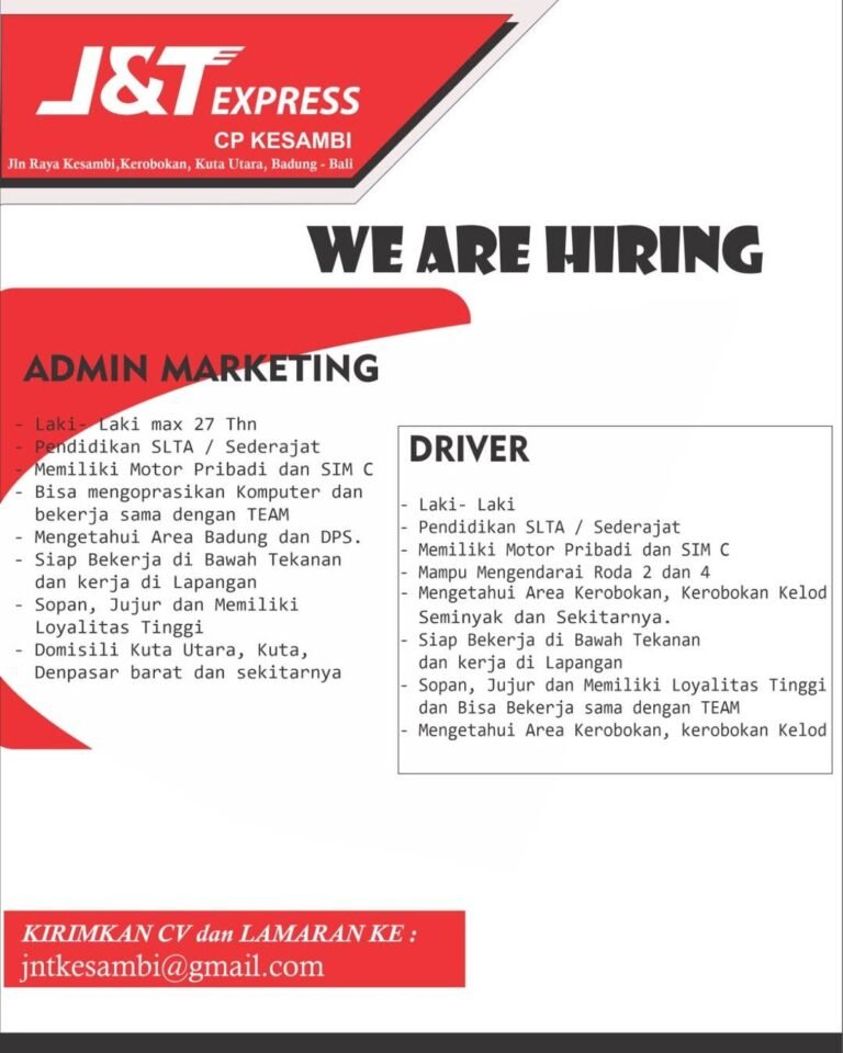 Bagi Anda yang berminat bergabung dengan keluarga besar J&T Express CP Kesambi yang berlokasi di Jln Raya Kesambi, Kerobokan, Kuta Utara, Badung, silakan segera mengirimkan berkas lamaran. Curriculum Vitae (CV) dan surat lamaran kerja dapat dikirimkan melalui alamat email resmi perusahaan di jntkesambi@gmail.com.