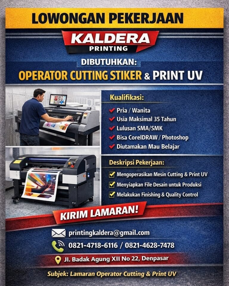 LOKER.BALINEWS.ID, DENPASAR – Sektor industri kreatif di ibu kota Bali terus berkembang, salah satunya ditandai dengan dibukanya kesempatan berkarir di Kaldera Printing. Perusahaan yang bergerak di bidang jasa cetak ini tengah mencari talenta muda untuk mengisi posisi Operator Cutting Stiker & Print UV guna ditempatkan di kantor mereka yang berlokasi di Jl. Badak Agung XII No 22, Denpasar. Kesempatan ini terbuka bagi pria maupun wanita dengan latar belakang pendidikan minimal lulusan SMA/SMK dan usia maksimal 35 tahun.