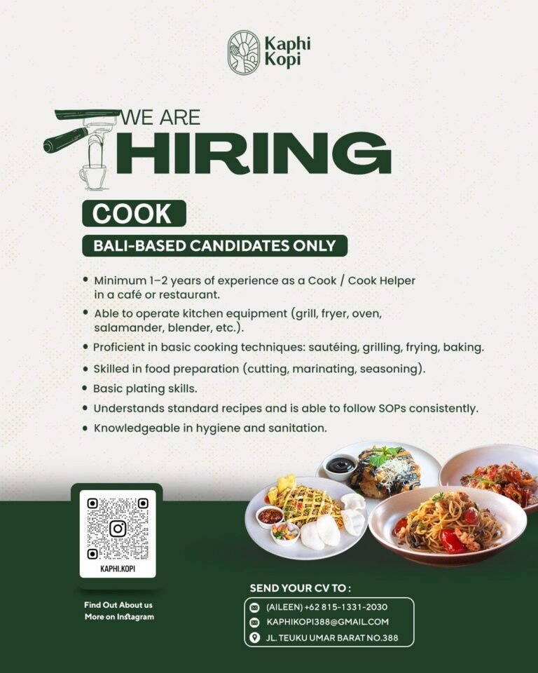 Sementara itu, posisi Cook ditujukan bagi pelamar yang memiliki pengalaman 1–2 tahun di dapur café atau restoran. Kandidat harus menguasai peralatan dapur, memahami teknik memasak dasar, memiliki keterampilan plating, serta mampu mengikuti SOP secara konsisten. Pengetahuan mengenai kebersihan dan sanitasi juga menjadi nilai penting. Pelamar dapat mengirimkan CV melalui email kaphikopi388@gmail.com atau menghubungi kontak yang tertera. Rekrutmen berlangsung hingga posisi terpenuhi.