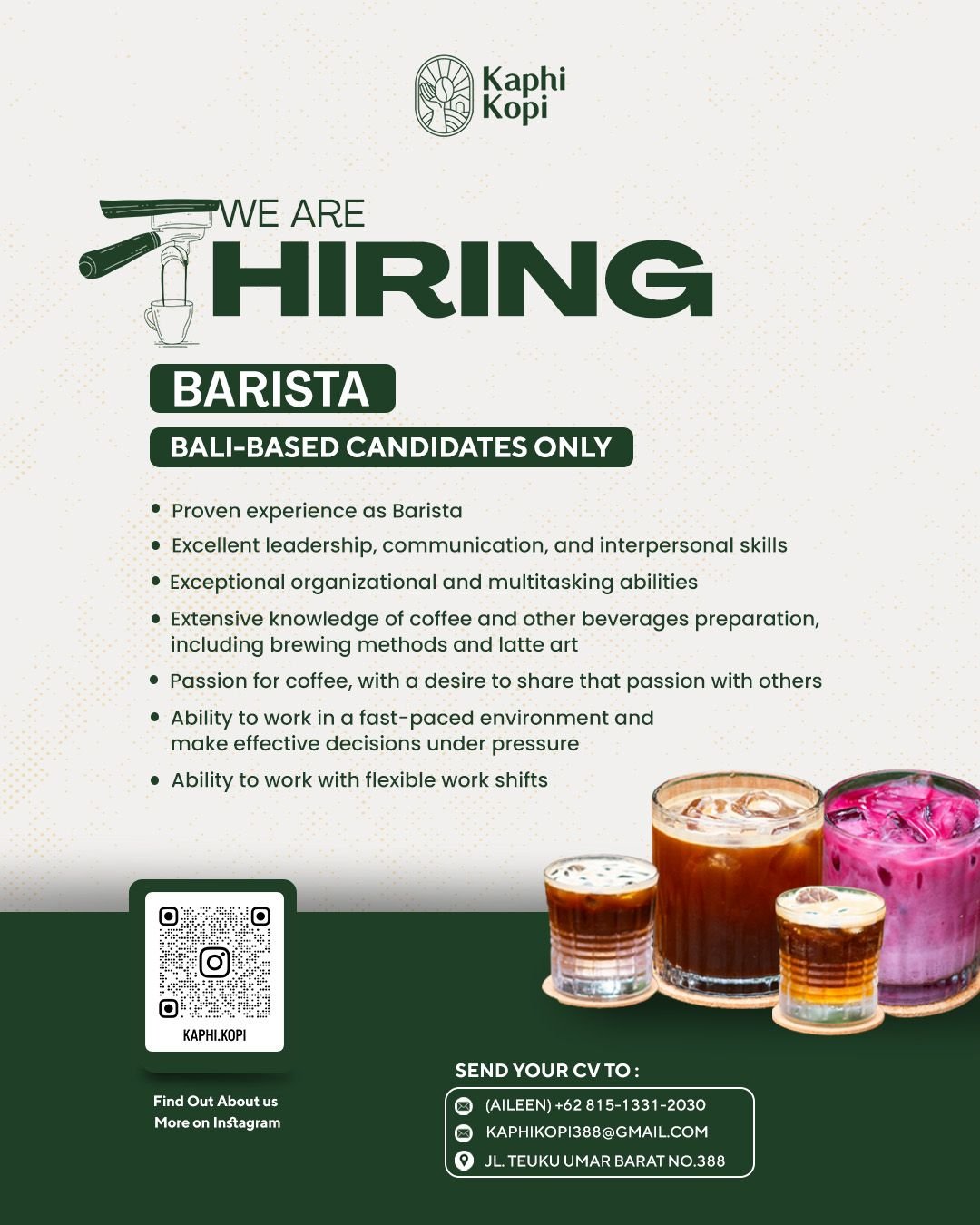 LOKER.BALINEWS.ID, DENPASAR – Kaphi Kopi membuka kesempatan kerja bagi kandidat berpengalaman yang berdomisili di Bali. Kedai kopi yang berlokasi di Jl. Teuku Umar Barat No. 388 ini membuka lowongan untuk posisi Barista dan Cook guna memperkuat tim operasional. Untuk posisi Barista, perusahaan mencari pelamar dengan pengalaman sebelumnya di bidang kopi, memiliki kemampuan komunikasi yang baik, serta memahami teknik pembuatan minuman dan latte art. Kandidat juga diharapkan mampu bekerja dalam ritme cepat dan siap menjalani sistem shift.