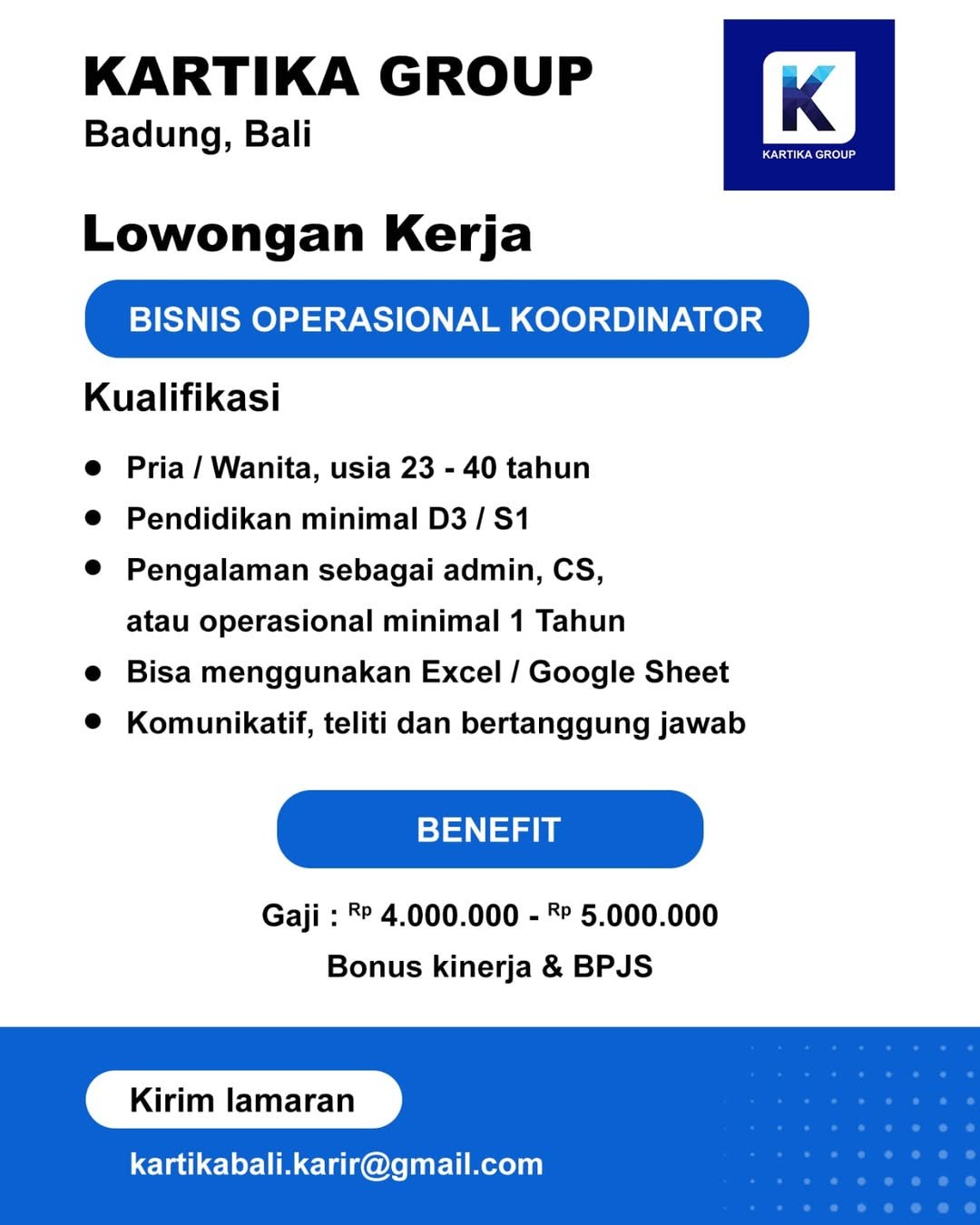 LOKER.BALINEWS.ID, BADUNG – Kartika Group, sebuah perusahaan yang berbasis di Kabupaten Badung, Bali, saat ini sedang membuka kesempatan karir bagi para profesional untuk mengisi posisi strategis sebagai Bisnis Operasional Koordinator. Lowongan ini terbuka bagi pria maupun wanita dengan rentang usia antara 23 hingga 40 tahun yang memiliki latar belakang pendidikan minimal lulusan D3 atau S1. Perusahaan mencari individu yang komunikatif, teliti, dan memiliki rasa tanggung jawab tinggi untuk memastikan seluruh proses operasional berjalan dengan optimal.
