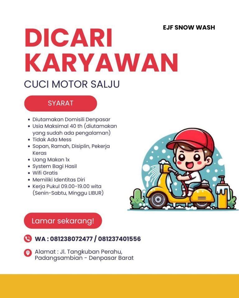 LOKER.BALINEWS.ID, DENPASAR – EJF Snow Wash, penyedia jasa pencucian kendaraan di area Denpasar Barat, saat ini sedang membuka kesempatan kerja bagi tenaga kerja produktif untuk mengisi posisi sebagai Karyawan Cuci Motor Salju. Usaha yang berlokasi di Jalan Tangkuban Perahu, Padangsambian ini mencari kandidat pria dengan usia maksimal 40 tahun, di mana mereka yang memiliki pengalaman di bidang serupa akan menjadi prioritas utama. Selain aspek teknis, kejujuran, sikap sopan, ramah, disiplin, serta semangat kerja keras menjadi kriteria utama yang harus dimiliki oleh setiap pelamar.