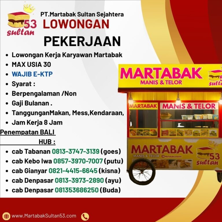 LOKER.BALINEWS.ID, DENPASAR — Martabak Sultan 53 kembali membuka lowongan kerja karyawan martabak untuk penempatan di beberapa cabang wilayah Bali. Kesempatan ini terbuka bagi pelamar dengan usia maksimal 30 tahun, memiliki E-KTP, serta siap bekerja dengan sistem jam kerja 8 jam. Kandidat dengan atau tanpa pengalaman tetap dipersilakan melamar, selama memiliki komitmen kerja dan tanggung jawab tinggi.