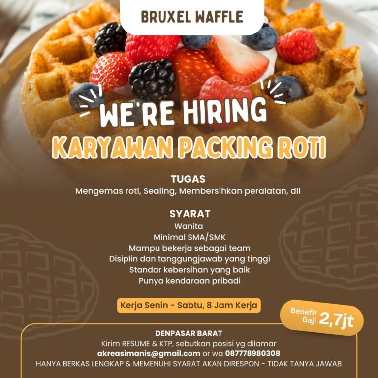 LOKER.BALINEWS.ID, DENPASAR — Bruxel Waffle kembali membuka Lowongan Kerja Bali Karyawan Packing Roti untuk penempatan area Denpasar Barat. Posisi ini ditujukan bagi pelamar wanita dengan pendidikan minimal SMA/SMK dan memiliki kedisiplinan tinggi. Tugas utama meliputi pengemasan roti, proses sealing, serta membersihkan peralatan produksi sesuai standar kebersihan perusahaan. Dengan sistem kerja Senin hingga Sabtu selama 8 jam per hari, kandidat diharapkan mampu bekerja sebagai tim dan menjaga kualitas produk sebelum dikirim ke pelanggan.
