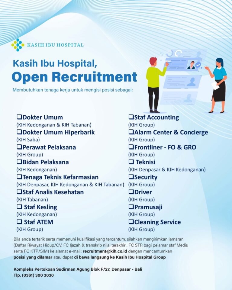 LOKER.BALINEWS.ID, DENPASAR – Kasih Ibu Hospital Group membuka lowongan kerja Bali untuk mengisi berbagai posisi tenaga medis dan non-medis di beberapa unit, antara lain Denpasar, Kedonganan, Tabanan, dan Saba.