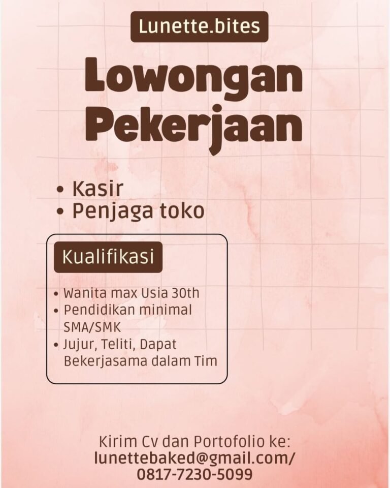 LOKER.BALINEWS.ID, DENPASAR – Lunette Bites membuka lowongan kerja Bali untuk posisi Kasir dan Penjaga Toko. Kesempatan kerja ini ditujukan bagi kandidat wanita dengan usia maksimal 30 tahun serta minimal lulusan SMA/SMK. Perusahaan mencari individu yang jujur, teliti, dan mampu bekerja sama dengan baik dalam tim. Posisi ini cocok bagi pencari kerja yang ingin berkarier di bidang ritel dan kuliner di Bali. Pelamar yang memenuhi kualifikasi dapat segera mengirimkan CV dan portofolio melalui email atau nomor kontak yang tersedia.