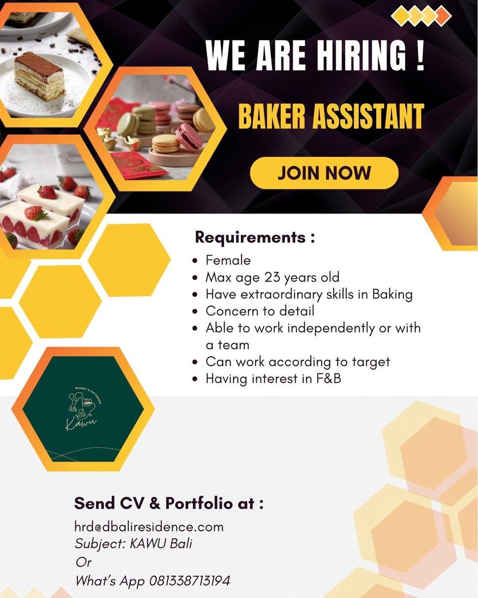 LOKER.BALINEWS.ID, BALI – Kawu Bakery, sebuah usaha yang bergerak di industri Food & Beverage (F&B) di Bali, sedang membuka kesempatan berkarir bagi tenaga muda untuk mengisi posisi sebagai Baker Assistant. Lowongan ini dikhususkan bagi wanita dengan usia maksimal 23 tahun yang memiliki minat besar serta semangat kerja di dunia pastry dan bakery. Kandidat yang dicari adalah mereka yang memiliki keterampilan luar biasa dalam teknik memanggang (baking) serta menunjukkan perhatian yang tinggi terhadap detail kualitas produk.