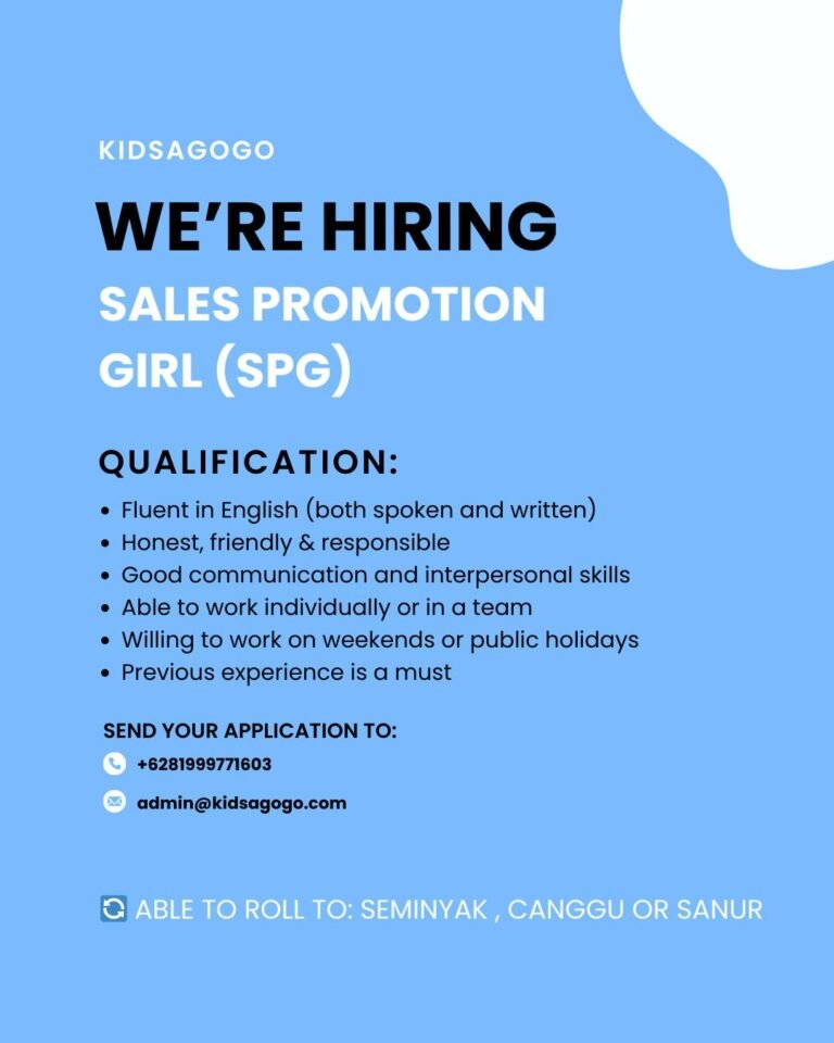 LOKER.BALINEWS.ID, BADUNG – Brand pakaian anak ternama, Kidsagogo, secara resmi membuka kesempatan karir bagi talenta muda di Bali untuk mengisi posisi Sales Promotion Girl (SPG). Lowongan ini ditujukan untuk memperkuat tim penjualan di beberapa titik strategis pariwisata guna memberikan pelayanan terbaik bagi pelanggan. Pihak manajemen mencari individu yang memiliki semangat kerja tinggi dan kemampuan komunikasi yang mumpuni untuk bergabung segera.