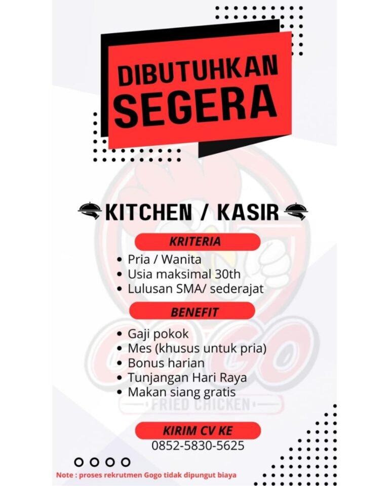 LOKER.BALINEWS.ID, BADUNG – Gogo Chicken saat ini membuka lowongan kerja Bali untuk posisi Kitchen dan Kasir yang akan ditempatkan di wilayah Jimbaran, Kabupaten Badung. Lowongan ini terbuka untuk pria maupun wanita dengan usia maksimal 30 tahun dan pendidikan minimal SMA/sederajat.