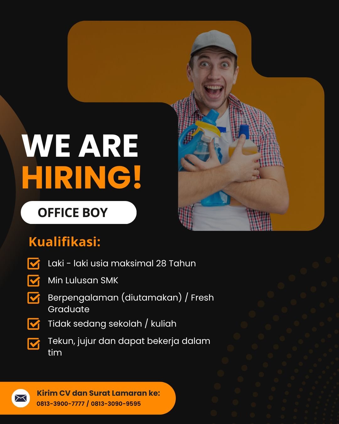 • Posisi Office Boy: laki-laki, maksimal 28 tahun, minimal lulusan SMK, fresh graduate dipersilakan, tidak sedang sekolah/kuliah, tekun & jujur.