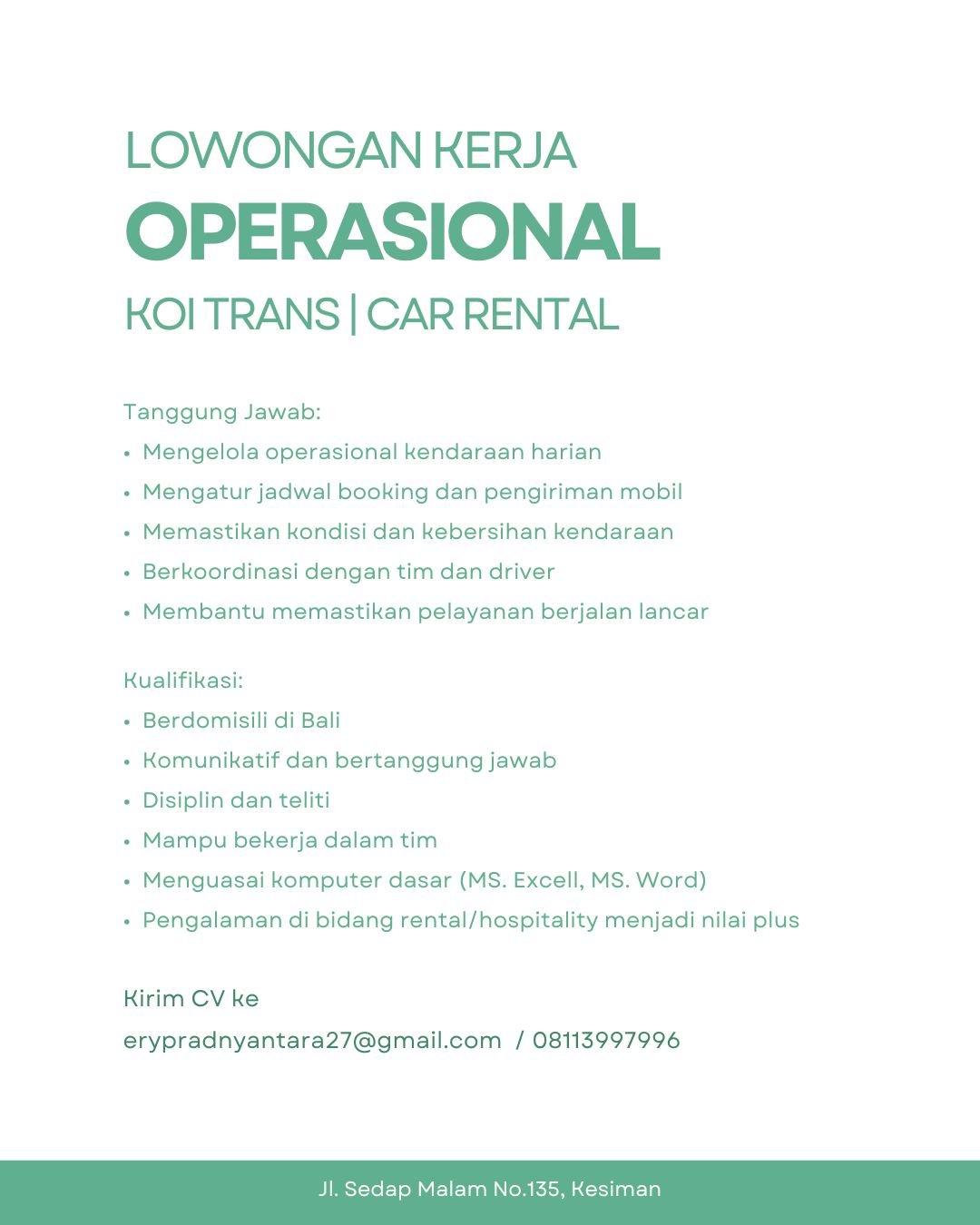 Bagi Anda yang memenuhi kualifikasi tersebut, segera kirimkan Curriculum Vitae (CV) terbaru ke alamat email erypradnyantara27@gmail.com atau melalui WhatsApp di nomor 08113997996. Anda juga dapat mengunjungi lokasi kantor di Jl. Sedap Malam No.135, Kesiman untuk informasi lebih lanjut. Jangan lewatkan kesempatan untuk bergabung dengan KOI TRANS dan kembangkan karir Anda di sektor pariwisata dan transportasi Bali.