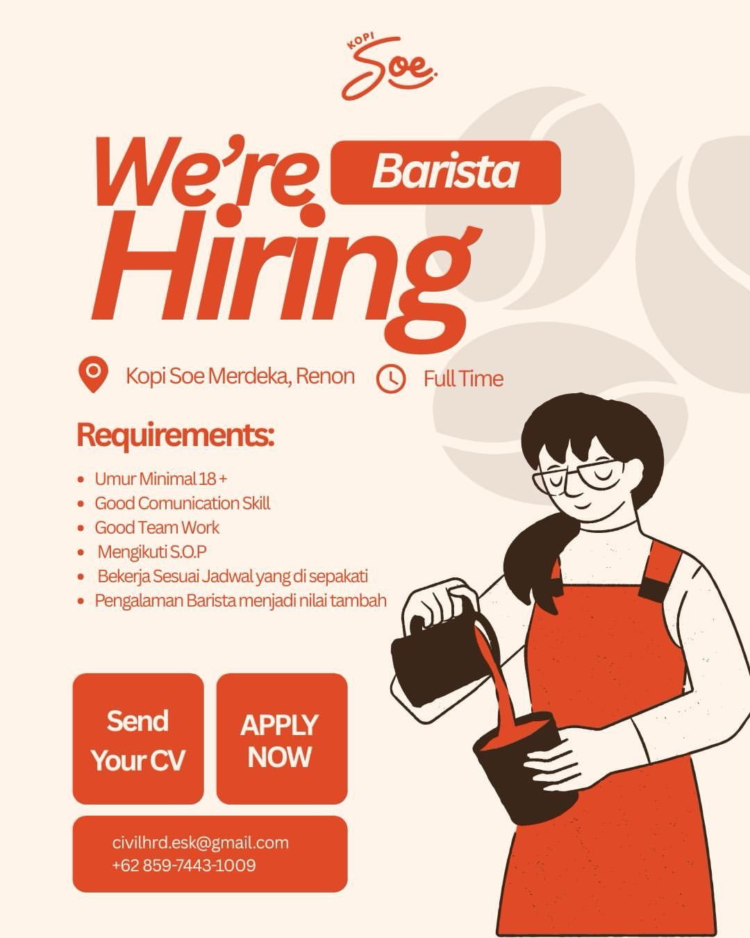 LOKER.BALINEWS.ID, DENPASAR – Kopi Soe Merdeka Renon membuka lowongan kerja untuk posisi Barista dengan sistem kerja penuh waktu. Perusahaan mencari kandidat berusia minimal 18 tahun, memiliki kemampuan komunikasi yang baik, mampu bekerja dalam tim, serta siap mengikuti SOP dan jadwal kerja yang telah disepakati. Pengalaman sebagai barista akan menjadi nilai tambah dalam proses seleksi.