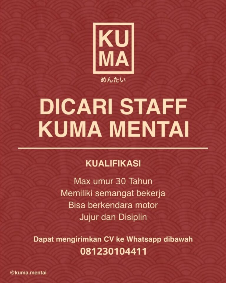 LOKER.BALINEWS.ID, BALI — Kuma Mentai membuka kesempatan kerja bagi kandidat yang memiliki semangat tinggi dan siap bergabung sebagai staff restoran. Perusahaan mencari pelamar dengan usia maksimal 30 tahun, memiliki etos kerja baik, serta mampu berkendara motor untuk mendukung mobilitas pekerjaan. Kejujuran dan disiplin menjadi nilai utama yang diutamakan dalam proses seleksi.