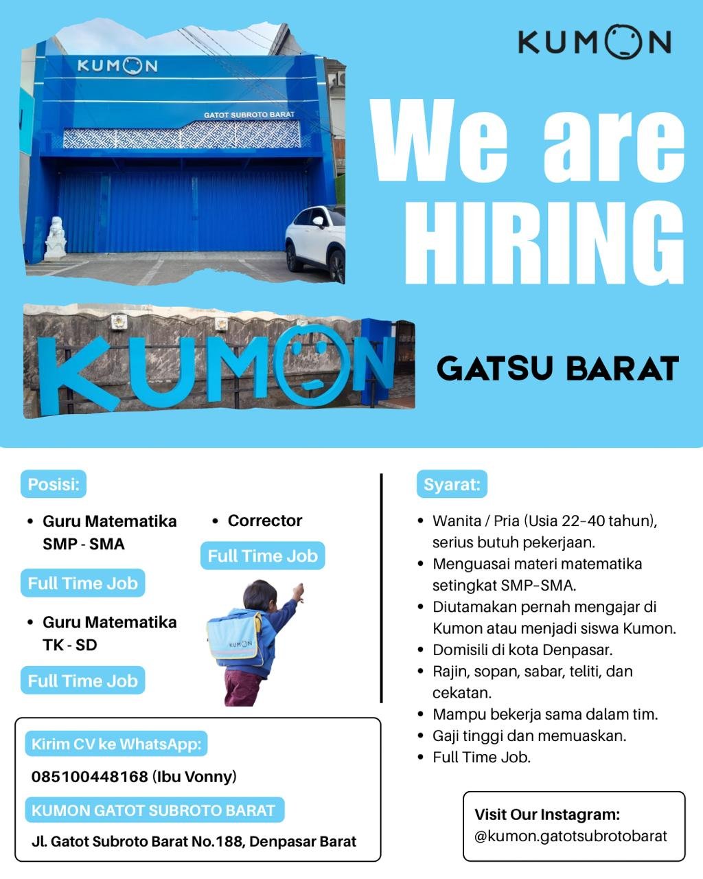 LOKER.BALINEWS.ID, DENPASAR – KUMON Gatsu Barat, lembaga pendidikan non-formal ternama yang berfokus pada pengembangan kemampuan akademik anak, kini membuka kesempatan karir bagi individu yang serius dan berdedikasi tinggi di dunia pendidikan. Lembaga ini tengah mencari kandidat untuk mengisi beberapa posisi purna waktu (Full Time Job), yaitu Guru Matematika (tingkat SMP-SMA), Guru Matematika (tingkat TK-SD), serta Corrector.