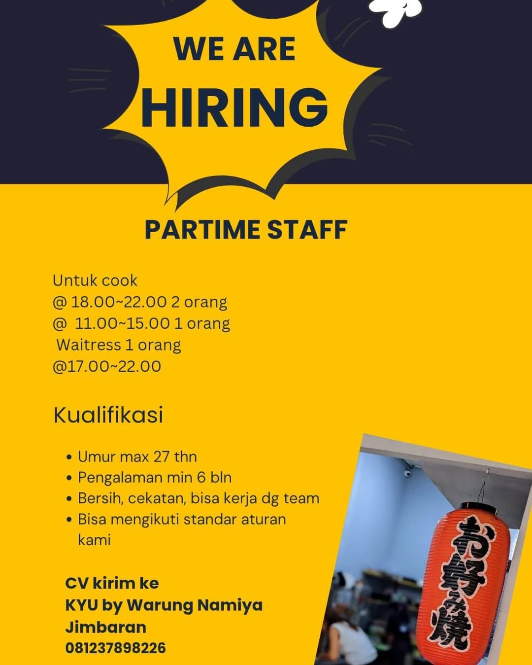 Bagi Anda yang memenuhi kualifikasi dan tertarik untuk bergabung, segera kirimkan berkas Curriculum Vitae (CV) Anda. Lamaran dapat ditujukan langsung ke KYU by Warung Namiya Jimbaran atau dikirimkan melalui kontak WhatsApp di nomor 081237898226. Jangan lewatkan kesempatan ini untuk berkarir di salah satu destinasi kuliner populer di wilayah Badung.