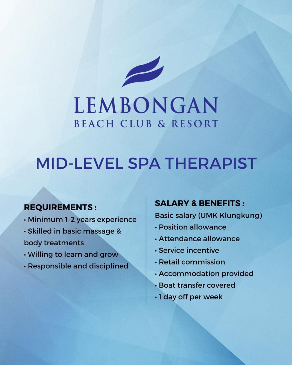 Untuk posisi Senior, kandidat diwajibkan memiliki pengalaman minimal 3 tahun serta menguasai teknik Swedish, Deep Tissue, dan Body Treatments. Sementara untuk posisi Mid-Level, terbuka bagi terapis dengan pengalaman 1-2 tahun yang memiliki kemampuan dasar pijat serta semangat untuk terus belajar dan berkembang. Kedua posisi ini mengharuskan kandidat memiliki kemampuan komunikasi bahasa Inggris dasar, bersikap profesional, disiplin, bertanggung jawab, serta mampu bekerja sama secara solid di dalam tim.