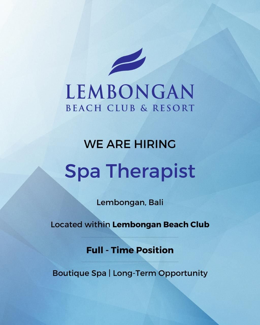 Bagi Anda yang memiliki kompetensi di bidang terapi spa dan ingin mengembangkan keahlian di lingkungan kerja profesional di tepi pantai, jangan lewatkan kesempatan ini. Karena gambar merupakan halaman depan, detail kualifikasi spesifik dapat ditemukan dengan menggeser (swipe) halaman informasi asli atau menghubungi pihak manajemen resor secara langsung. Segera siapkan berkas lamaran terbaik Anda untuk bergabung dengan keluarga besar Lembongan Beach Club & Resort.