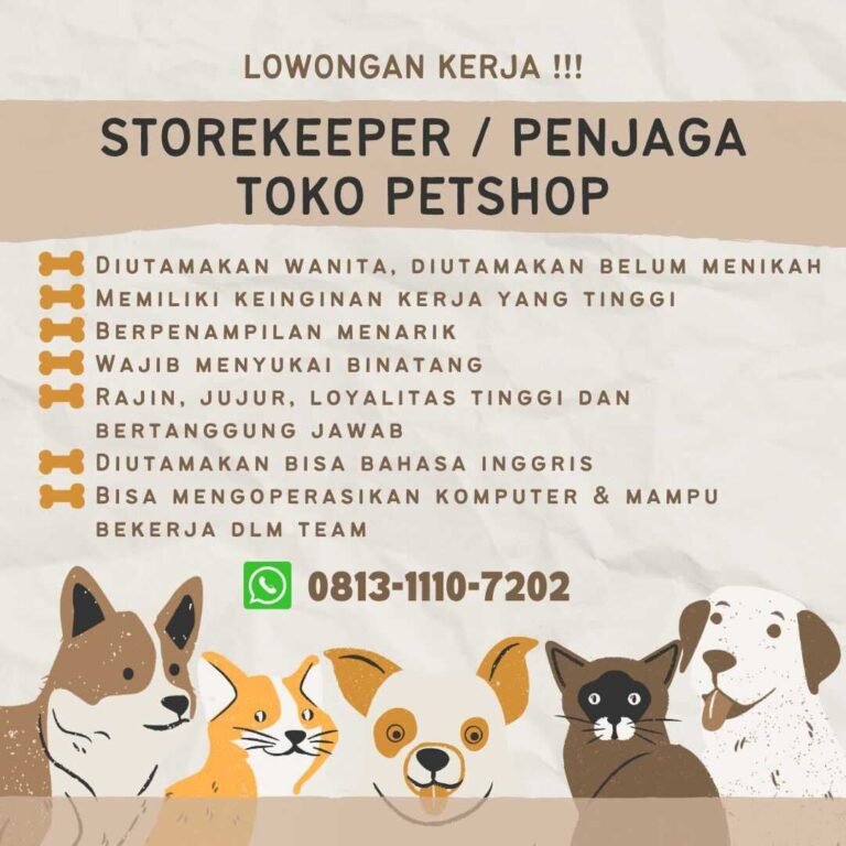 LOKER.BALINEWS.ID, BALI – Industri perawatan hewan peliharaan di Bali terus berkembang, dan kini sebuah Petshop sedang mencari kandidat yang tepat untuk posisi Storekeeper atau Penjaga Toko. Lowongan ini sangat cocok bagi Anda yang memiliki kasih sayang besar terhadap binatang. Kriteria utama yang dicari adalah wanita, diutamakan yang belum menikah, serta memiliki keinginan kerja yang tinggi dan berpenampilan menarik.