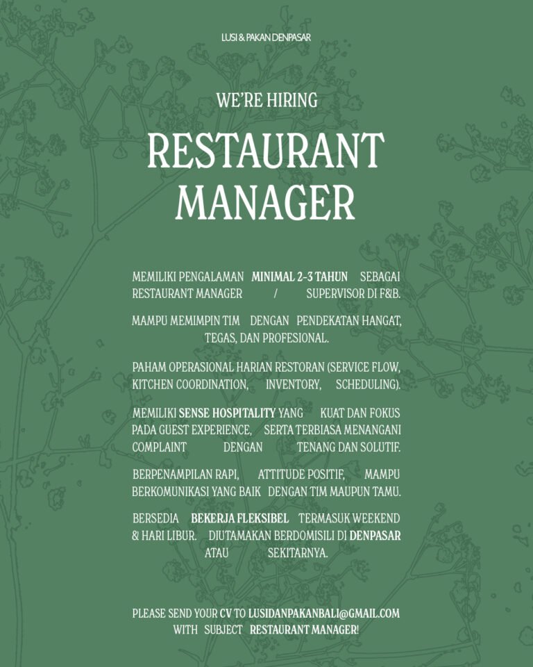 LOKER.BALINEWS.ID, DENPASAR – Lusi & Pakan Denpasar saat ini tengah membuka kesempatan berkarir bagi para profesional di industri kuliner untuk mengisi posisi strategis sebagai Restaurant Manager. Lowongan ini ditujukan bagi individu yang memiliki pengalaman minimal 2-3 tahun sebagai Restaurant Manager atau Supervisor di bidang Food & Beverage (F&B). Kandidat yang dicari adalah pemimpin yang mampu mengelola tim dengan pendekatan yang hangat, tegas, dan profesional, serta memiliki pemahaman mendalam mengenai operasional harian restoran mulai dari service flow, koordinasi dapur, inventaris, hingga pengaturan jadwal (scheduling).